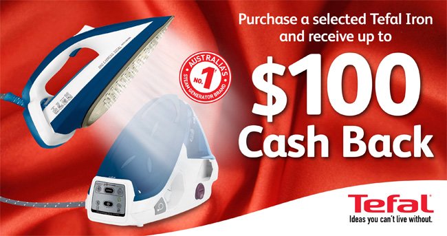 Purchase a selected Tefal Iron and receive up to $100 cash back. Cash Back Gift Card via redemption on a selected range of Steam Generators and Steam Irons.
